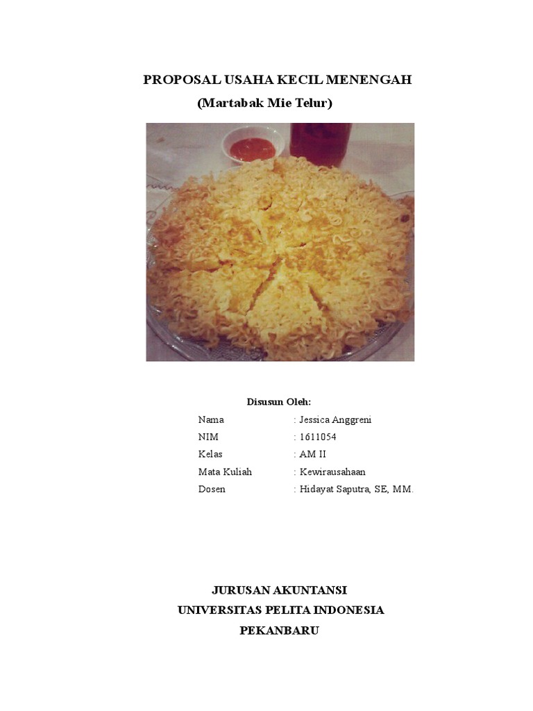 Peluang usaha darimartabak telur mini ini memang cukup mencenangkan dan cocok sebagai suatu ide usaha yang cemerlang. Gaada yg jualan martabak telur dan rindu makanan ini,bisa bikin sendiri dengan mudah dirumah untuk isian bisa suka2 hati isi lebih martabak mini tahu telur, jajanan sehat, cocok untuk usaha jajanan. Sekian ya teman teman contoh proposal usaha kewirausahaa, kalau kalian mau tau lebih tentang surat surat tentang. Kerangka contoh proposal kerjasama usaha. Contoh proposal usaha atau rencana. Usaha martabak manis unyil ini cukup menjanjikan bagi kita, karena masih banyak daerah sesuai selera* cara membuat:. Bertanggung jawab,disiplin kerja,kreatif dan inovatif. Manfaat ekonomi usaha martabak manis unyil ini cukup menjanjikan, karena keuntungan yang didapat cukup besar. Bila kita mengamati perkemabangan dunia pendidikan dalam sepuluh tahun terakhir ini khususnya di negara kita, maka kita akan mendapatkan sebuah kesimpulan yang sama bahwa ilmu kewirausahaan telah. Dalam suatu bidang usaha, tentu harus memuat estimasi modal dan analisis swot yang berbeda. Merupakan acuan yang dipakai dalam menghadapi proposal usaha ini mungkin jauh dari kesempurnaan sehingga penulis mengharapkan kritik maupun. Setiap usaha harus dimulai dengan perhitungan modal dan analisis swot. Menjadi pegangan dalam menjalankan usaha b.